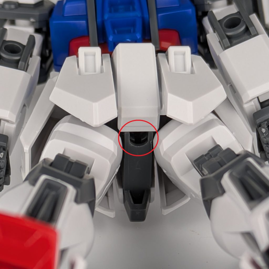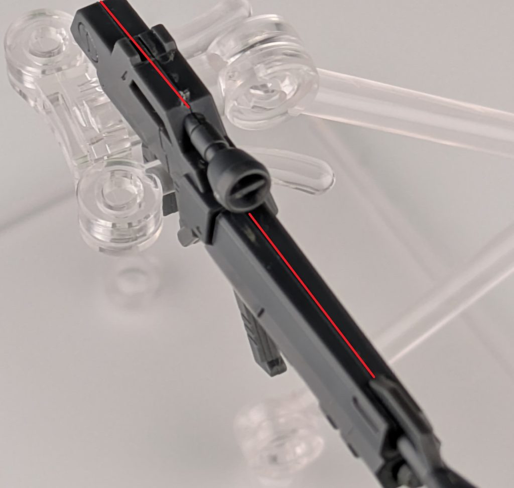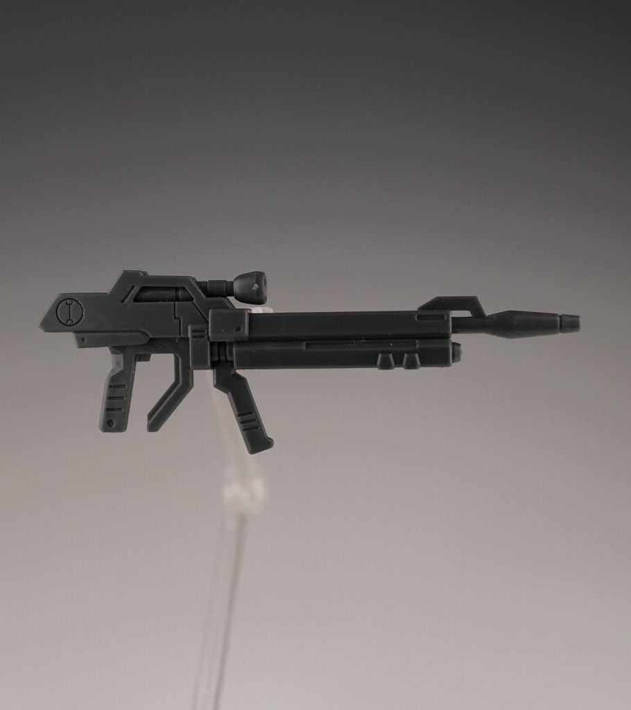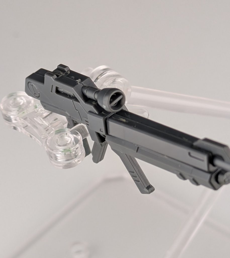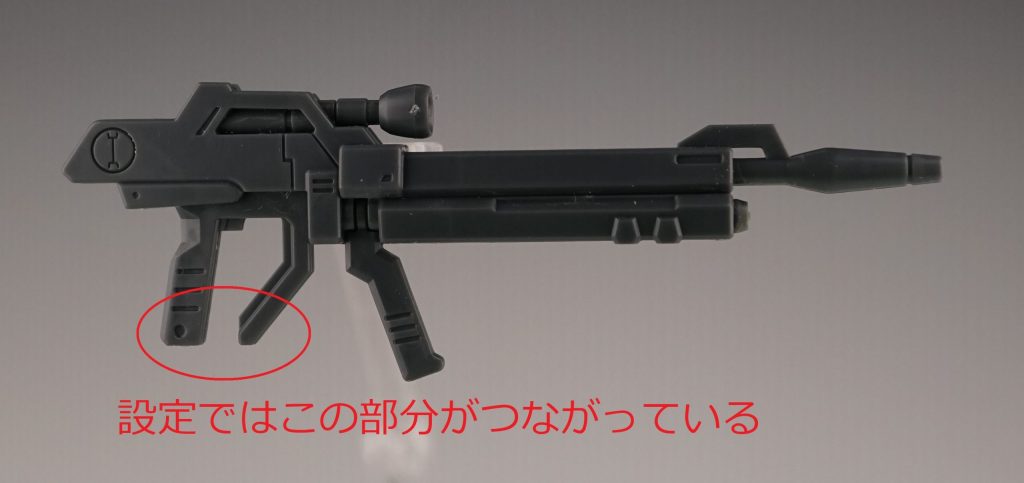 ハンドパーツの構造に合わせるためだと思うのですが、ビームライフルのデザインが設定と少し変更されています。設定どおりにする場合は、ライフルのグリップの部分を改造する必要があります。