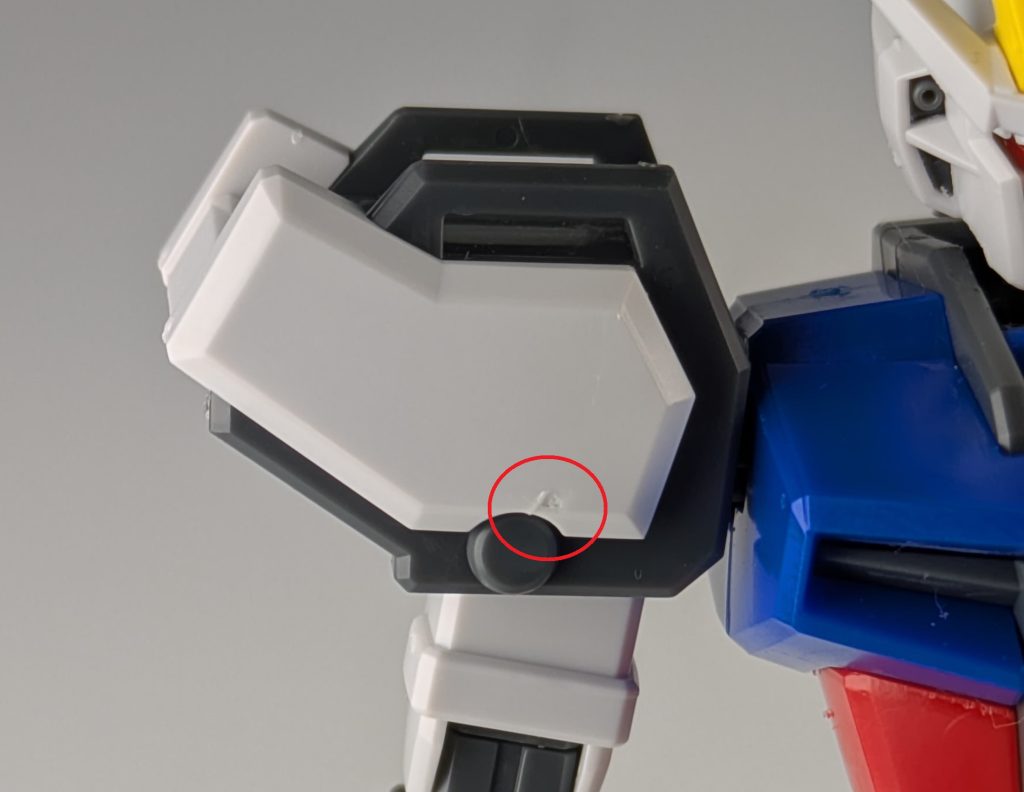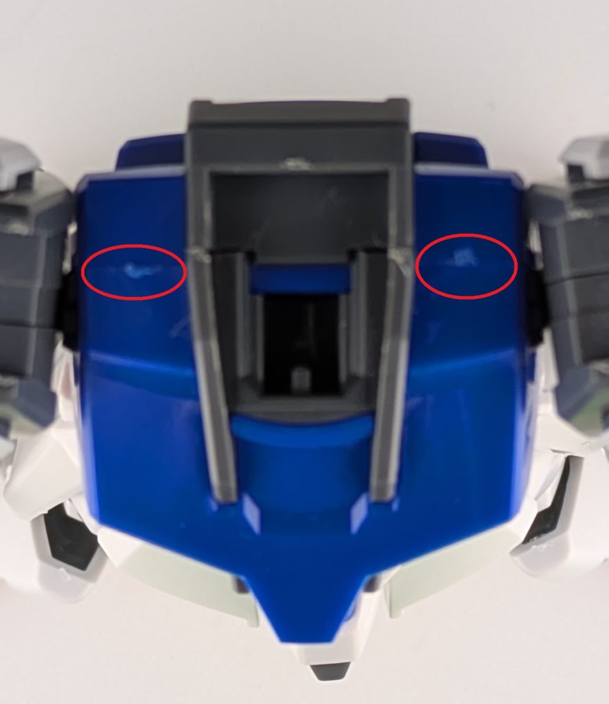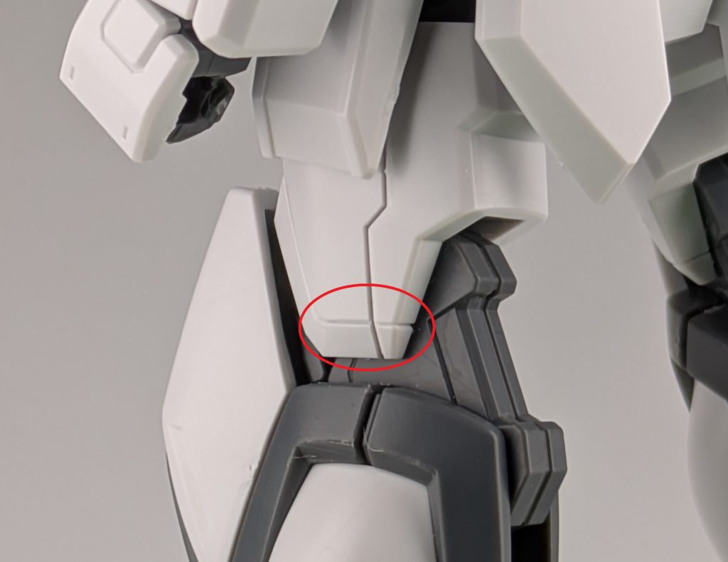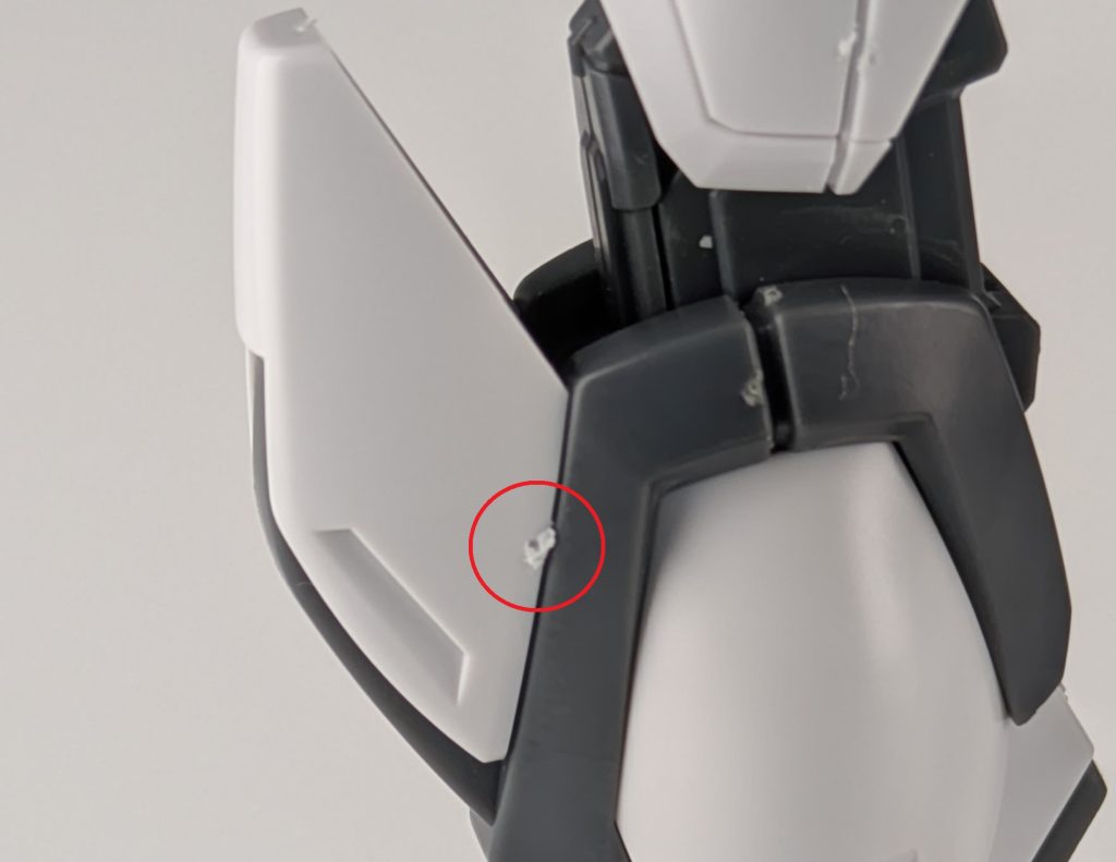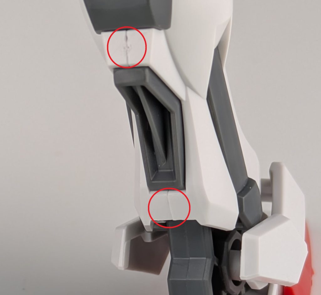 合わせ目は足のふとももとふくらはぎの部分と胴体の肩の部分にありますが、ほとんど目立たないです。またビームライフルもモナカ構造のため合わせ目があります。
